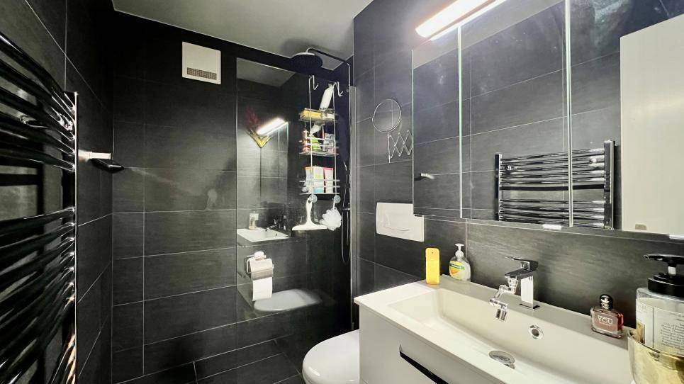 Ce dernier bénéficie de trois chambres à coucher dont une avec sa propre salle de bain moderne et design, toutes, donnant plein Ouest. La seconde salle d'eau dispose actuellement d'une colonne de lavage qui a été mise en lieu et place de la douche initiale.