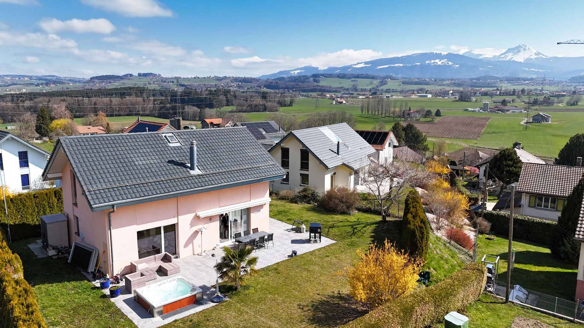 À Granges (Veveyse), dans un quartier résidentiel calme entre campagne et commodités, cette villa individuelle de 2007 s'inscrit dans un environnement ouvert et lumineux. Depuis la terrasse de 100 m², le regard porte sur les Préalpes fribourgeoises. On est à la campagne, mais la gare est à quelques minutes à pied, sans nuisance.