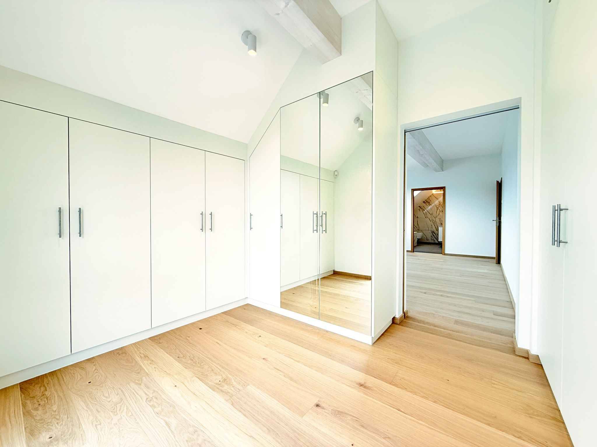 À l’étage, l’espace nuit accueille trois chambres aux proportions généreuses, dont une suite parentale remarquable. Celle-ci offre une salle de bains complète avec baignoire, douche à l’italienne et double vasque, un dressing sur mesure et une atmosphère intime, presque feutrée, propice au repos. Les salles d’eau, habillées de matériaux nobles, prolongent cette exigence de qualité et de durabilité.
