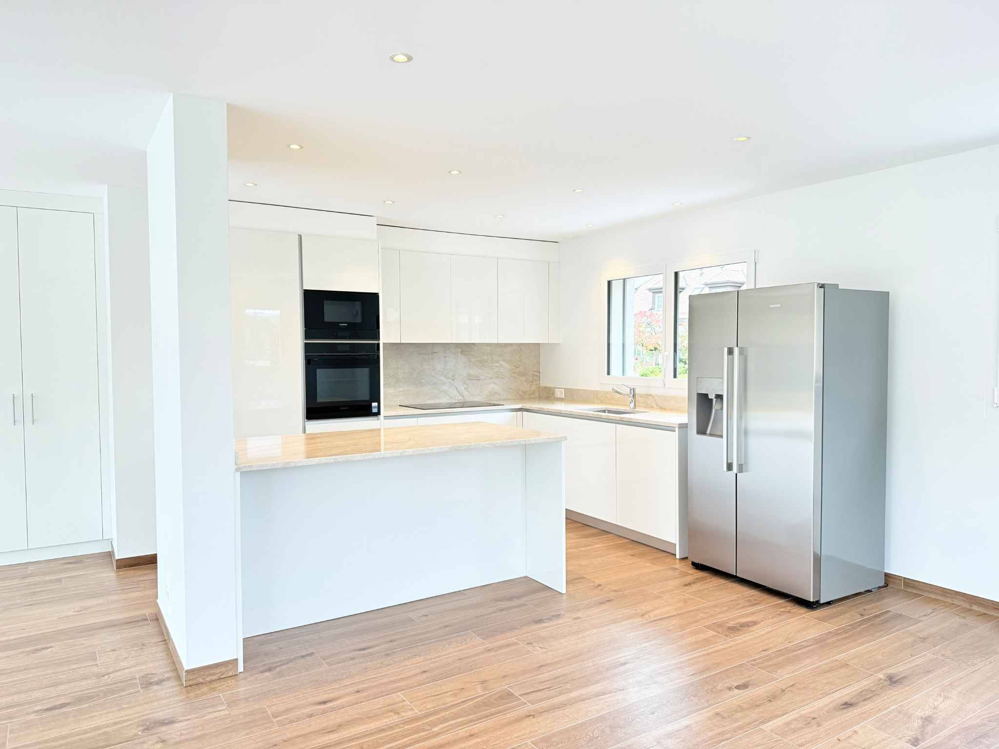 Dès l’entrée, la maison affirme ses volumes. Le hall s’ouvre naturellement sur un vaste séjour baigné de lumière, sublimé par de larges baies vitrées pleine hauteur qui prolongent l’espace vers le jardin. La cuisine ouverte, véritable pièce de vie, séduit par son électroménager haut de gamme et son îlot central en pierre naturelle, pensé pour les moments de partage comme pour l’élégance du quotidien. Chaque détail a été soigneusement étudié : rangements intégrés, variateurs d’éclairage, volets électriques et finitions d’une grande précision dessinent un intérieur à la fois épuré et fonctionnel.
